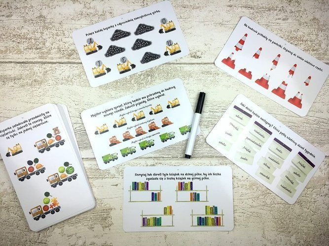 100 różnorodnych zadań zostało dostosowanych do zdolności percepcyjnych dzieci w tym wieku. Doskonalą one kompetencje matematyczne, logiczne i językowe (m.in. dzielenie wyrazów na głoski i sylaby), uczą klasyfikowania przedmiotów, pozwalają ćwiczyć precyzję i spostrzegawczość. Ćwiczenia przygotowane przez doświadczonych pedagogów wspierają rozwój grafomotoryczny i przygotowują do nauki pisania, a dzięki specjalnemu, suchościeralnemu flamastrowi dołączonemu do zestawu, można je wykonywać wielokrotnie.