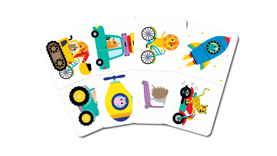 Barwne ilustracje Magdaleny Popovics prezentują uwielbiane przez dzieci pojazdy, takie jak: wywrotka, autobus, wyścigówka, helikopter, rakieta czy hulajnoga. Celem gry jest wykorzystanie wszystkich kafelków i ułożenie ich w odpowiednich miejscach, tak aby utworzyć ciąg pasujących do siebie pojazdów.