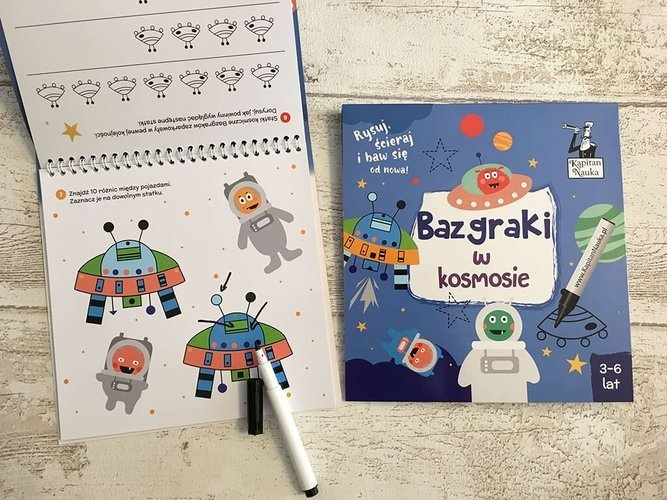 Pogodne ilustracje Poli Augustynowicz zabiorą dzieci w niezwykłą wyprawę w kosmos. Dzięki dołączonemu do zestawu suchościeralnemu flamastrowi odpowiedzi można zmazywać i poprawiać bez końca, a wygodny, większy format sprawi, że z rozwiązywaniem zadań nie będą miały problemu już trzylatki.