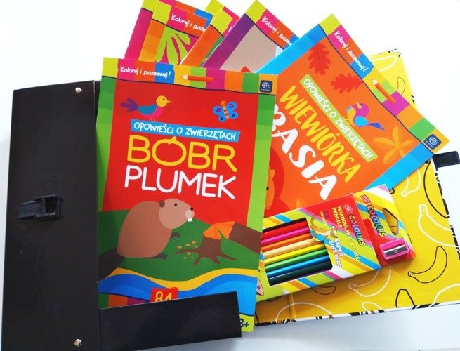 - Zestaw zawiera: siedem kolorowanek "Opowieści o zwierzętach": Kot Mruczek, Świstak Ząbek, Zając Uszak, Bocian Klekotek, Wiewiórka Basia, Kaczka Kwaczka i Bóbr Plumek. Do zestawu dołączone są kredki z temperówką. Całość zapakowana w teczkę w pingwiny.