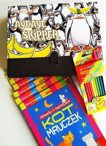 Do zestawu dołączony jest zestaw kredek z temperówką, a całość zapakowana jest w kolorową teczkę z Pingwinami z Madagaskaru, dzięki czemu Twoje dziecko będzie mogło wszędzie je ze sobą zabierać i kolorować w dowolnej chwili.