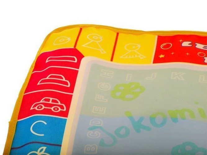 Mata wodna jest 4 kolorowa dzięki czemu powstaną kolorowe rysunki. Wokół pola do malowania umieszczone są kolorowe rysunki podpowiadające jak łatwo namalować np. autko, jabłko, zajączka, domek, parasol, tort itp. Oprócz tego na macie znajdują się cyfry i literki, dzięki czemu dziecko będzie mogło ćwiczyć ich pisownie.