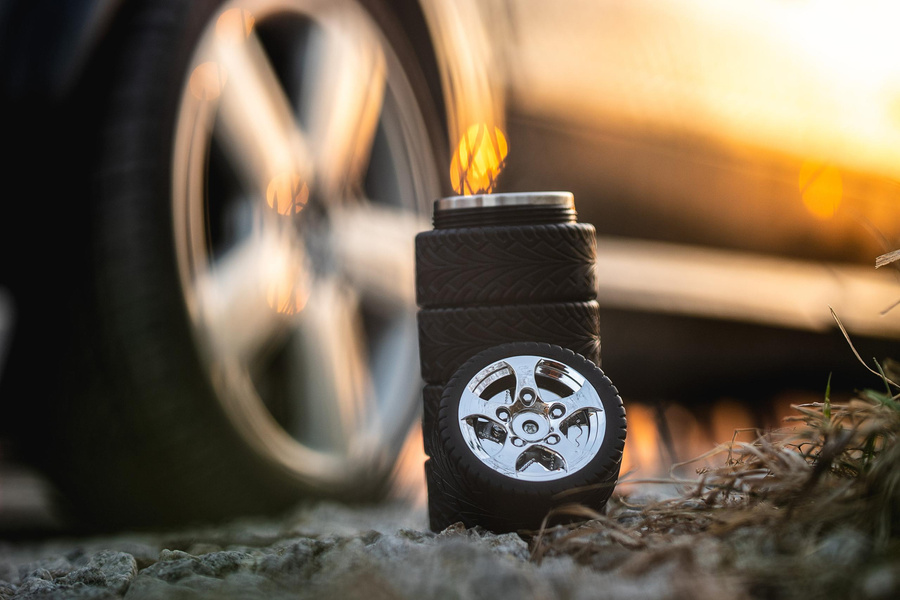 - kubek w kształcie 4 samochodowych opon + 5 koło zapasowe jako dekielek