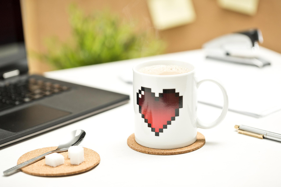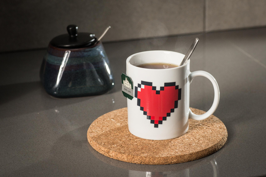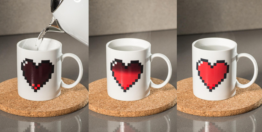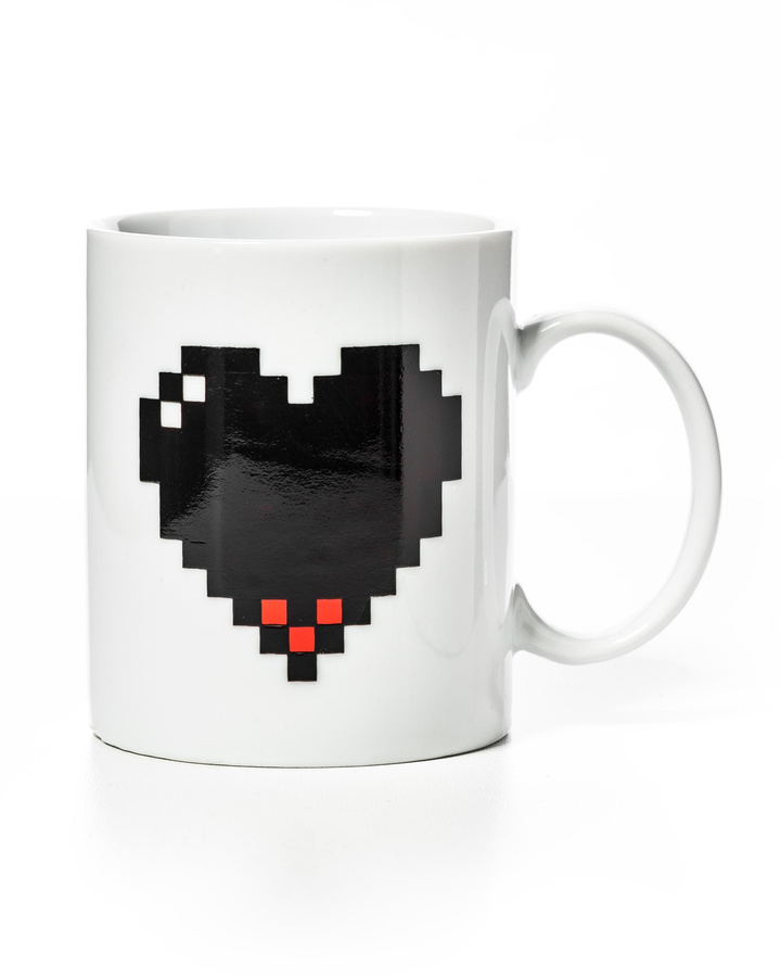 Gadżet bliski sercu każdego maniaka komputerowego, który z rozrzewnieniem wspomina czasy 8 bitowych gier, a teraz z zaciekawieniem spogląda na kwadratowy świat Minecrafta. Pikselowe serce zmieni swój czarny kolor na właściwy czerwony po zalaniu kubka gorącą wodą.