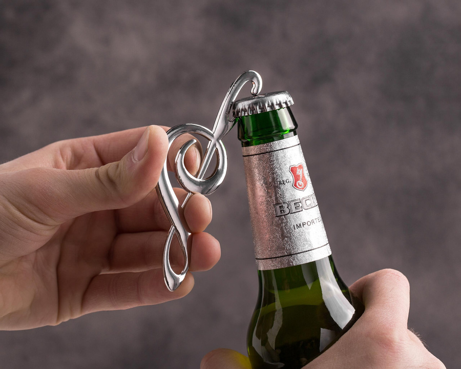 Śpiewająco i koncertowo otworzysz każdą butelkę z naszym otwieraczem muzyka. To świetny gadżet dla wszystkich czujących pozytywne wibracje, gdy słuchają muzyki, a także dla tych, dla których otwieranie butelek jest jak miód na uszy ;)