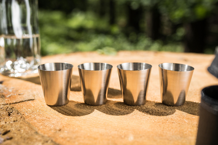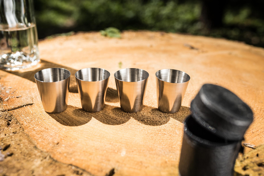 Świetny zestaw podróżny, choć nie tylko dla spragnionych. Cztery kieliszki ze stali szlachetnej. Całość zapakowana w etui z ekologicznej skóry.