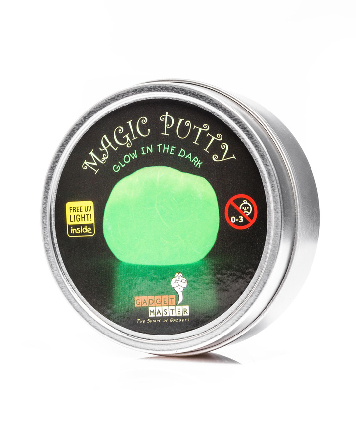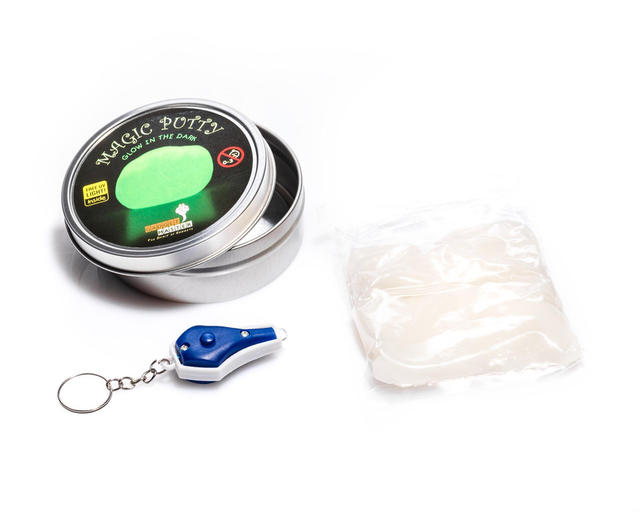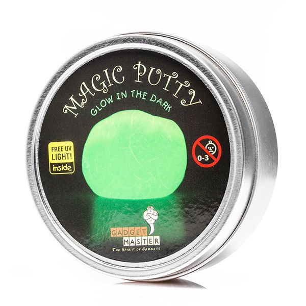 Nowa odmiana tzw. myślącej masy tym razem świecąca w ciemnościach, by zabawa była jeszcze lepsza. Pamiętacie z pewnością, ile radości daje i ile godzin spędziliście z magnetyczną masą i mocnym magnesem dołączonym do zestawu. Teraz kolej na równie dobrą zabawę z masą świecącą w ciemności i dołączoną latarką UV, którą możecie kreślić dowolne wzory na masie. Gdy tylko zgasicie światło lub zrobi się nagle ciemno, wszystkie tajne napisy czy wzory zaczną nagle świecić. Można kogoś postraszyć, zaintrygować czy też zainspirować do nietypowej i kreatywnej rozrywki. Masa posiada oczywiście wiele innych ciekawych właściwości, możecie ją ugniatać dla odstresowania (uwaga, to bardzo wciąga :)), odbijać jak gumową piłeczkę, rozciągać, rozrywać, przyklejać, lepić z niej różne kształty, oczywiście podświetlać latarką UV i tak dalej. Jak zwykle, to od Waszej wyobraźni zależy, jakie zastosowania znajdziecie jeszcze dla tej masy i jej innych wcieleń :)