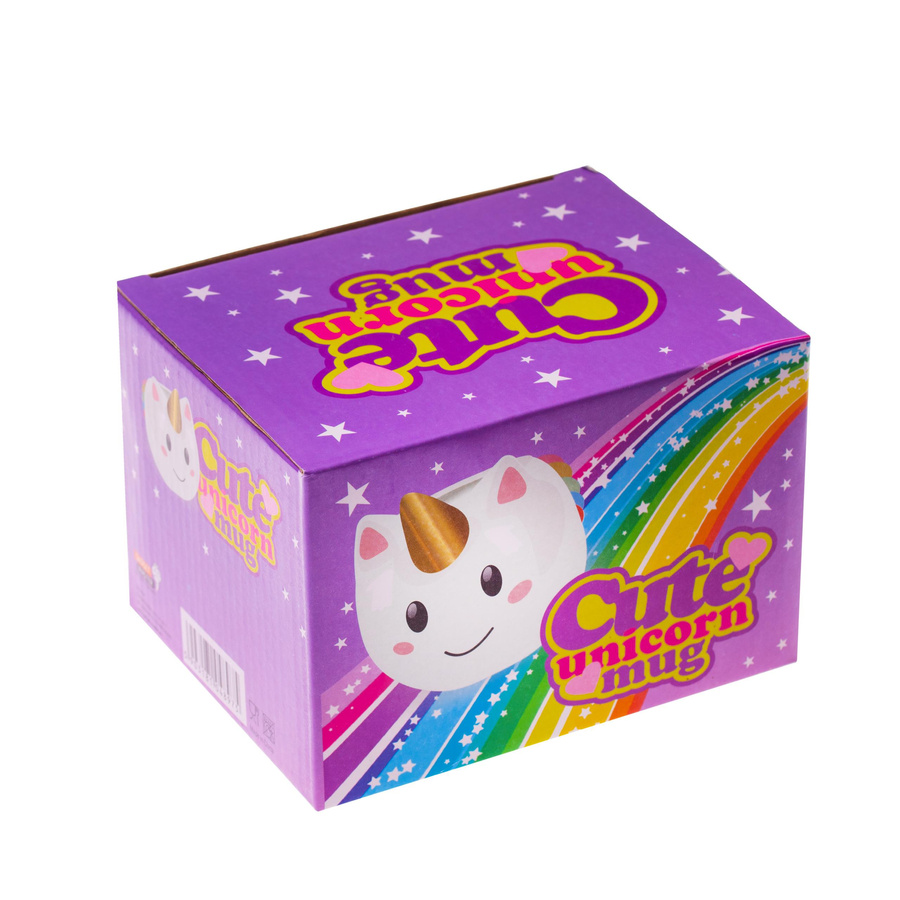 Wesoły i kolorowy kubek jednorożec ze złotym rogiem. Tęczowe uszko oraz uśmiechnięta buźka sprawiają, że każdy, kto używa ten kubek, czuje się jakby patrzył na świat przez różowe okulary ;)