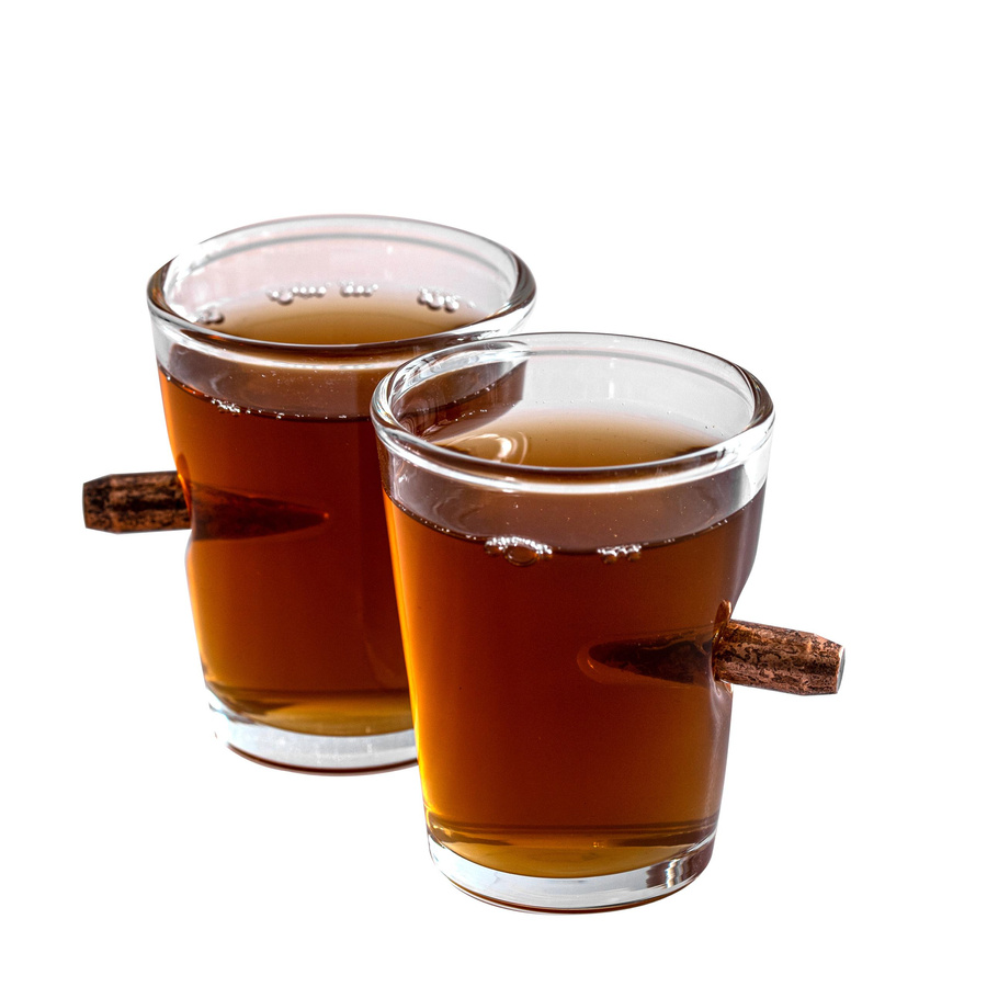 • Oryginalny zestaw dwóch kieliszków z zastygłym w szkle pociskiem, by emocje towarzyszące opróżnianiu szkła były jeszcze większe.
