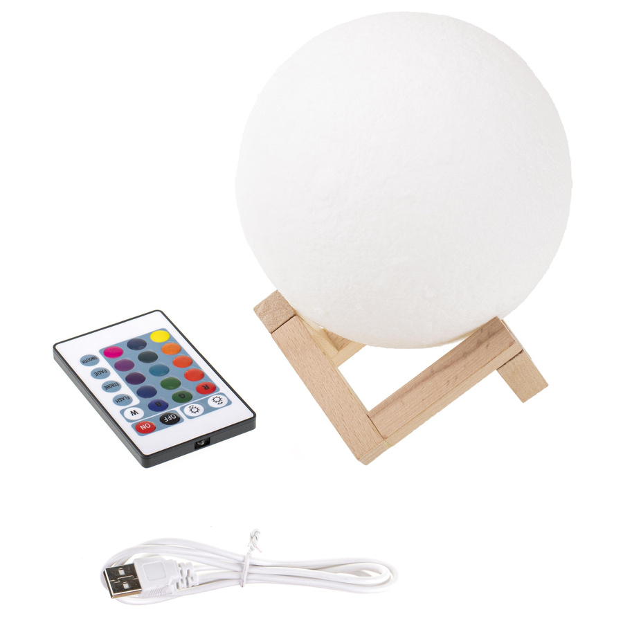 Lampa LUNA 3D to nie tylko piękne trójwymiarowe odwzorowanie powierzchni księżyca, kraterów uderzeniowych i wyżyn, ale również możliwość podziwiania go aż w 16 kolorach. Wygodne sterowanie pilotem, wystarczy podłączyć lampkę do zasilania przez dołączony kabel USB, naładować ją, umieścić na stylowej drewnianej podstawce, a następnie cieszyć się już przez kilka godzin pięknym światłem naszego księżyca