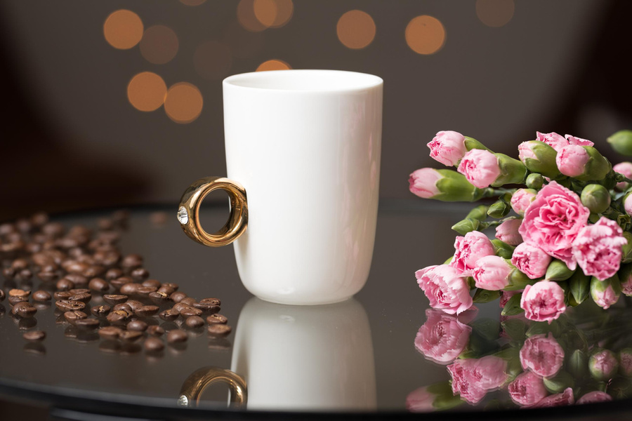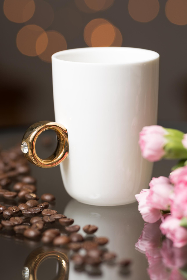 - wyjątkowy porcelanowy kubek do kawy z uszkiem w kształcie pierścionka z diamentem