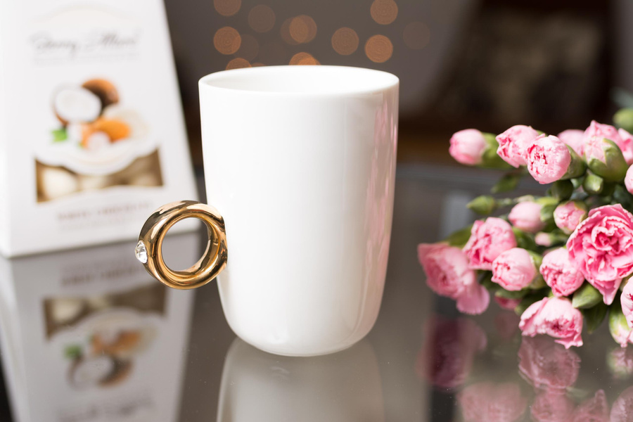 Złoty pierścionek z jasnym kryształem to szczególny symbol miłości, wyjątkowej przyjaźni czy szacunku. W tym wypadku łączy się nietypowo, ale w jakże oryginalny sposób z… kubkiem do kawy. Podaruj go swojej żonie, dziewczynie, mamie czy koleżance z pracy, a kawa czy herbata pita z tego kubka nigdy nie będzie smakować tak samo, będzie smakować o niebo lepiej, przywodzić na myśl gorące uczucia obdarowującego, a zazdrosne spojrzenia otoczenia poprawią dodatkowo samopoczucie.