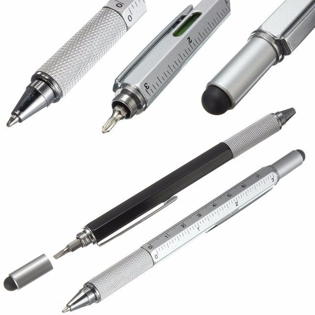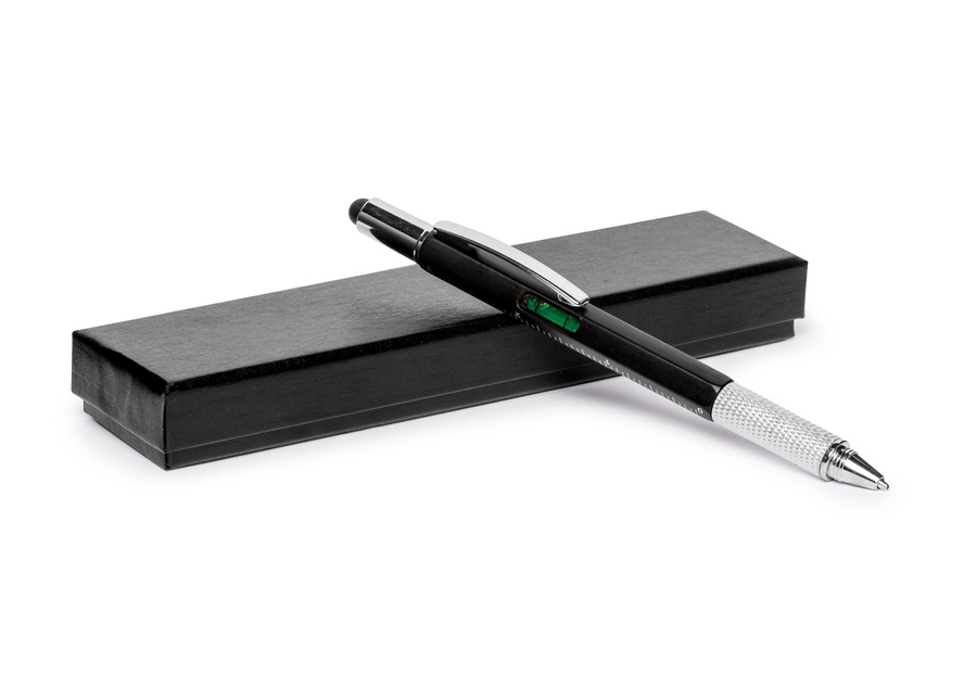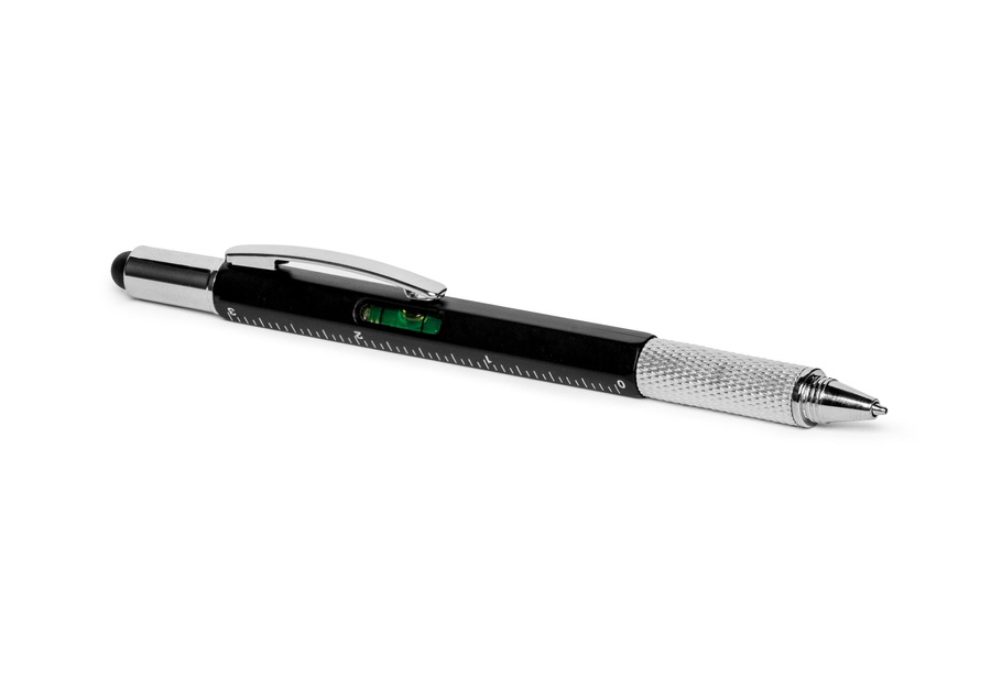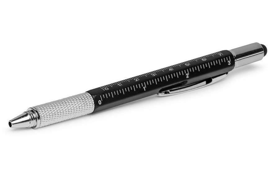 Multiutalentowany długopis sprawdzi się w wielu sytuacjach, z których pozwoli wyjść obronną ręką. Po co mieć długopis, który tylko pisze, skoro można mieć długopis o kilku zastosowaniach i znacznie większych możliwościach. Oprócz funkcji pisania nasz długopis może służyć jako tzw. stylus, ponieważ ma gumową końcówkę do ekranów dotykowych. Po jej odkręceniu można skorzystać z końcówki śrubokrętu, z jednej strony płaskie, z drugiej krzyżakowej. Na korpusie długopisu znajduje się miarka w centymetrach i calach (7 cm i 3 cale) oraz minipoziomica.