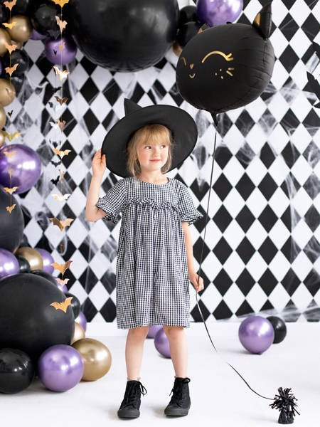 Matowy balon foliowy Kotek w czarnym kolorze ze złotymi metalizowanymi elementami.