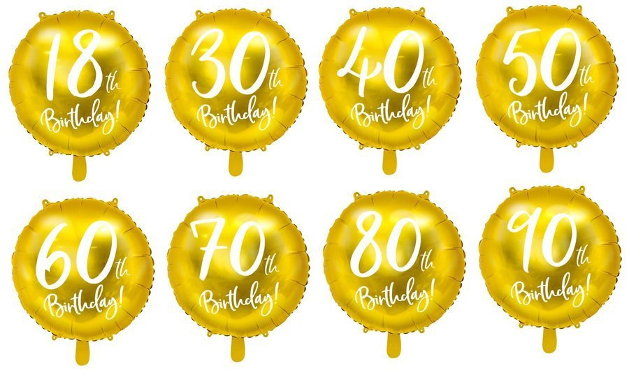 - Balon w kolorze złotym, z białym napisem. Balon foliowy 18" przeznaczony do pompowania helem lub powietrzem. Cena za sztukę.