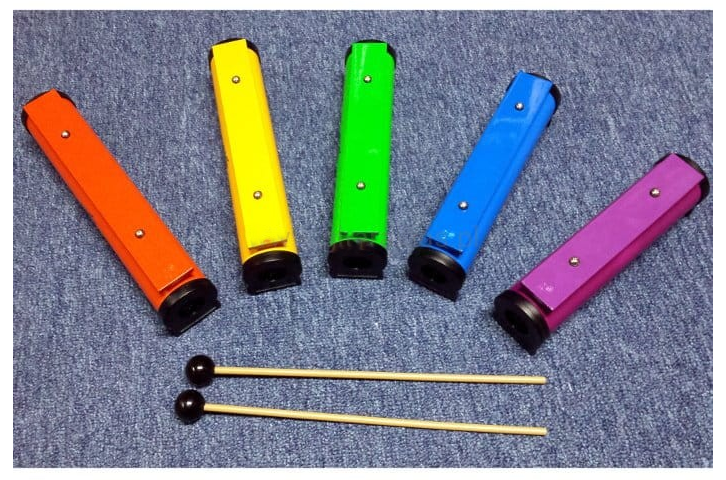 Każda metalowa sztabka pomalowana jest w kolorze danego dźwięku i solidnie przykręcona do plastikowego rezonatora.