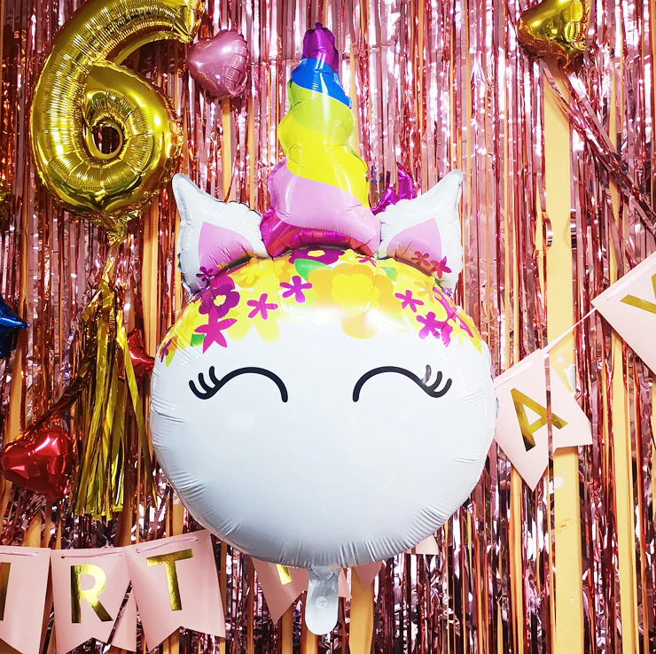 Błyszczący, okrągły balon foliowy Jednorożec w białym kolorze z kolorowym nadrukiem.