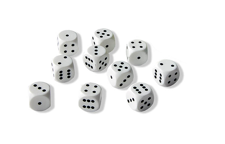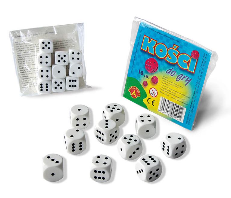 Kostki białe z dużymi, widocznymi czarnymi kropkami.