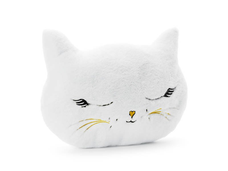Poduszka Kotek wykonana z miękkiego pluszu w kolorze białym / delikatnie kremowym z wyhaftowanymi elementami.
