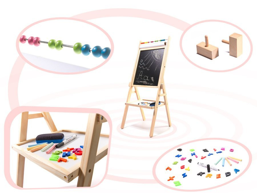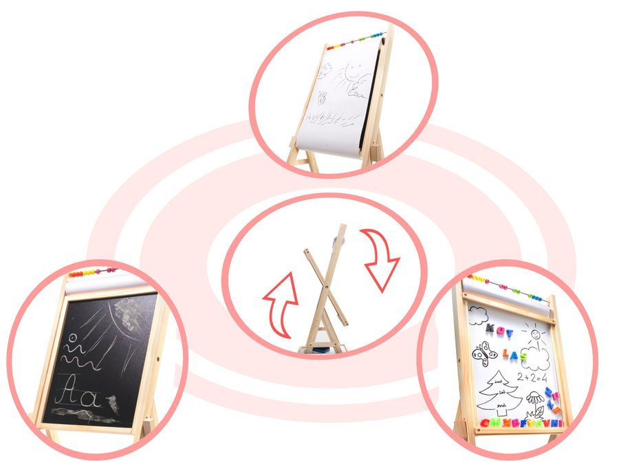 - Podwójna tablica na stelażu - na zestaw składa się z czarna tablica kredowa, która po przewróceniu, staje się białą tablicą, odpowiednią do mazaków. Biała strona tablicy jest tablicą magnetyczną.