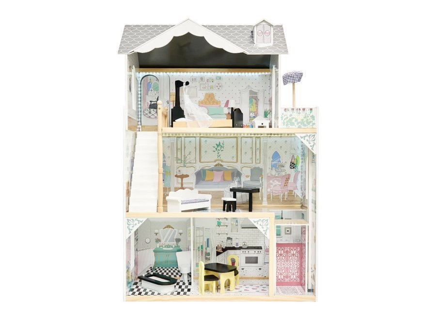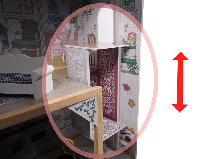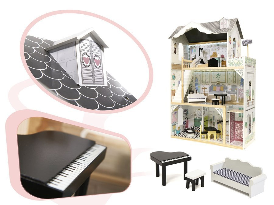 Które małe dziecko nie marzy o pięknej willi dla swoich lalek, maskotek i figurek? Najlepiej wystarczająco dużej, by móc również ugościć laleczki swoich przyjaciół.Piękny drewniany domek dla lalek w nowoczesnym stylu, będzie spełnieniem marzeń każdego dziecka.Ogromna piętrowa rezydencja została wyposażona w 4 niezależne pomieszczenia, balkon i windę.