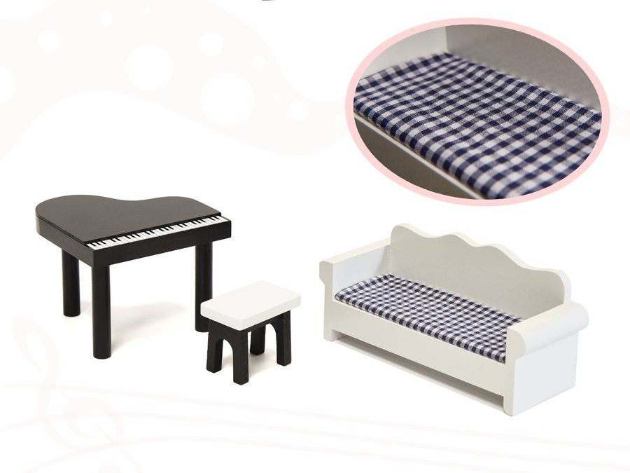 Wśród mebelków znajdziesz: stolik 2x Krzesełka wannę Toaleta WC Fortepian stołek Kanapa Łóżko z baldachimem Lampka Szafka nocna Parasol