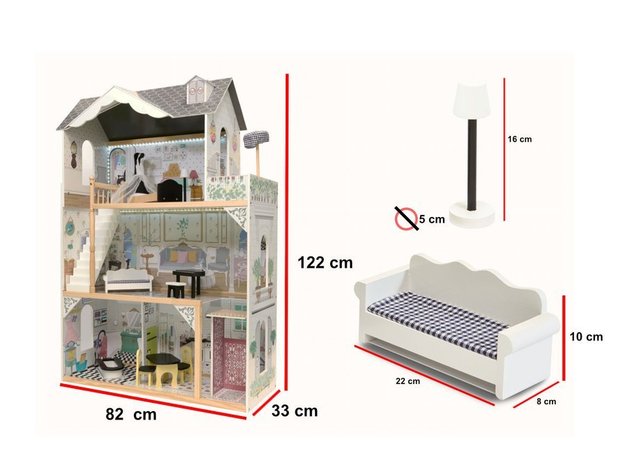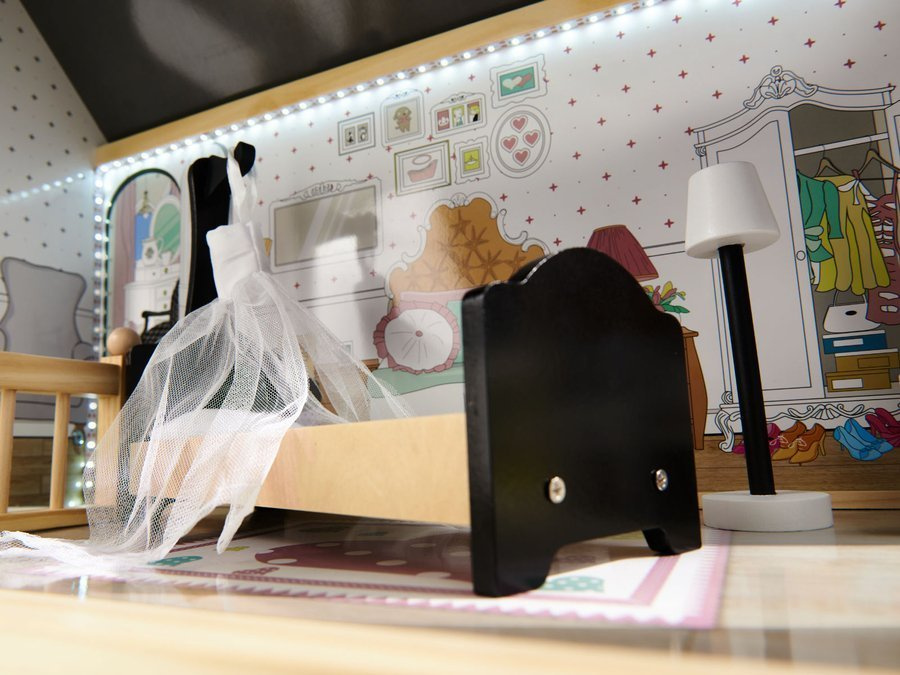Miniaturki mebli, grafiki na ścianach i oświetlenie LED tworzą domek wyjątkowym i sprawią, że jest bardzo przytulny.Wszystkie elementy domku zostały starannie wyszlifowane w taki sposób, aby podczas zabawy dziecko nie wbiło drzazgi w rączki.Domek nie tylko zagwarantuje świetną zabawę, ale również będzie wspaniałą dekoracją do pokoju dziecięcego.