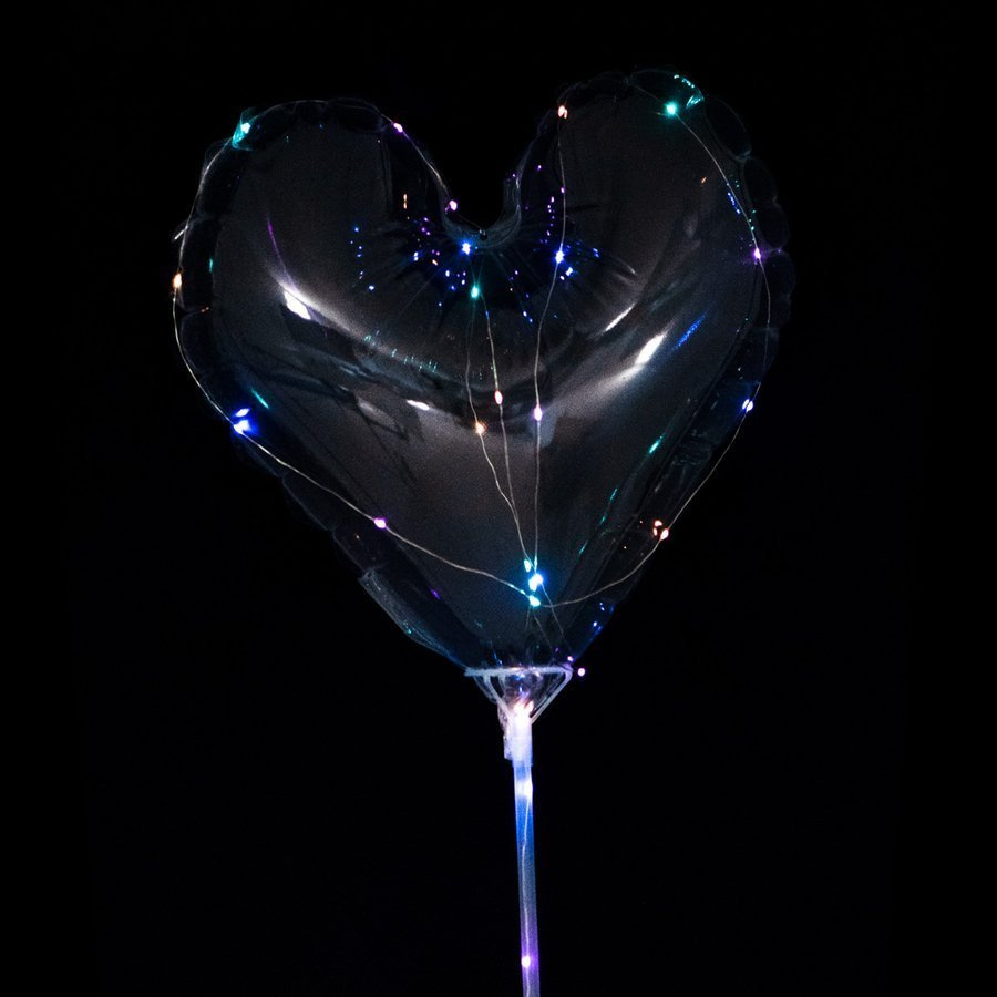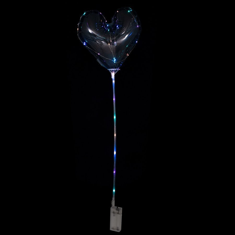 • Transparentny balon w kształcie serca. W zestawie z lampkami, patyczkiem i koszyczkiem. Do napełnienia powietrzem. Doskonały jako dekoracja imprez organizowanych po zmroku. Zasilanie: 2x bateria AA 1,5V. Długość patyka ok. 60cm.