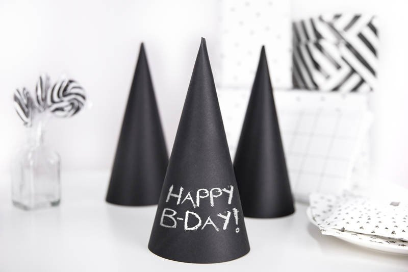 Papierowa, czarna czapeczka w kształcie stożka, do samodzielnego złożenia.