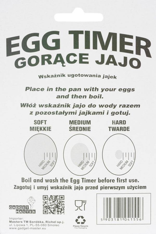 Zastanawiasz się, jak ugotować perfekcyjnie jajka, by było dokładnie takie jak lubisz Ty czy Twoja rodzina? Z naszym minutnikiem gorące jajo staje się to dziecinnie proste! Wystarczy, że do jajek, które chcesz ugotować, dołożysz nasz minutnik gorące jajo, a ono zmieniając kolor wskaże Ci, czy jajka są jeszcze na miękko, już na twardo, a może wciąż pomiędzy. Jajo nie mierzy czasu, jak prosty minutnik, co bywa zawodne, ale działa w oparciu o temperaturę. Na specjalnej podziałce możesz zobaczyć, jaki "stan skupienia" ma Twojej jajko w danej chwili. Gdy ciemny kolor dojdzie do "soft" na podziałce, to jajko jest na miękko, "medium" oznacza średnio ugotowane , "hard" natomiast sygnalizuje, że jest już na twardo. Smacznego!