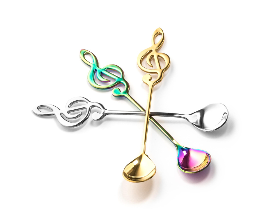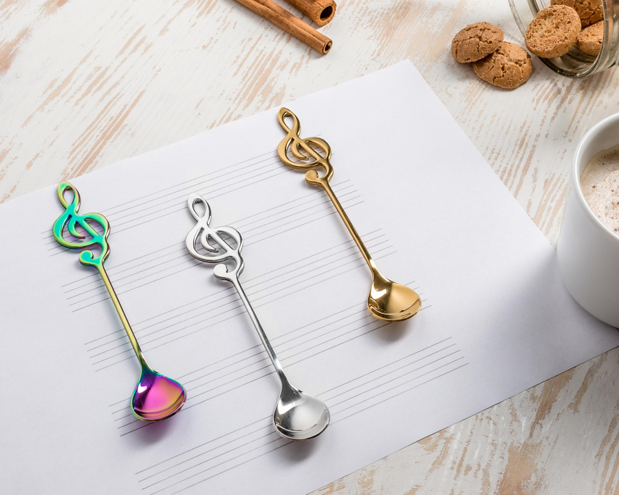 Zamieszaj pozytywnie już od rana, Twoją ulubioną kawę lub herbatę, z naszymi muzyczni łyżeczkami z rączką w kształcie klucza wiolinowego. Muzyczne łyżeczki w trzech kolorach, złotym, srebrnym i tęczowym, by każdy meloman odnalazł coś dla siebie, a wszystko poszło śpiewająco :)