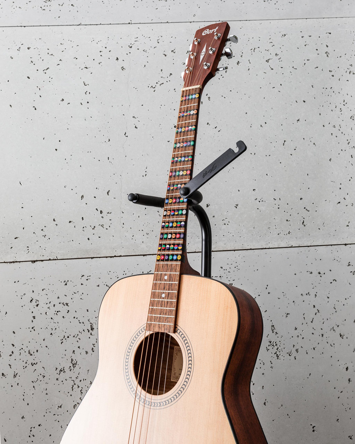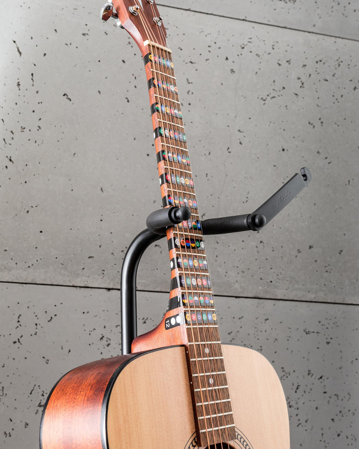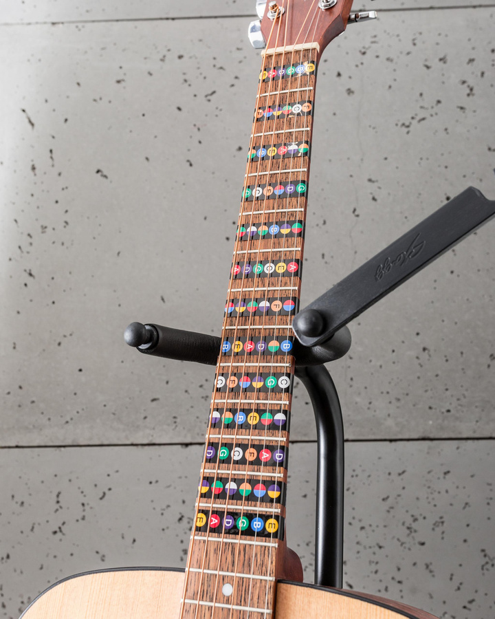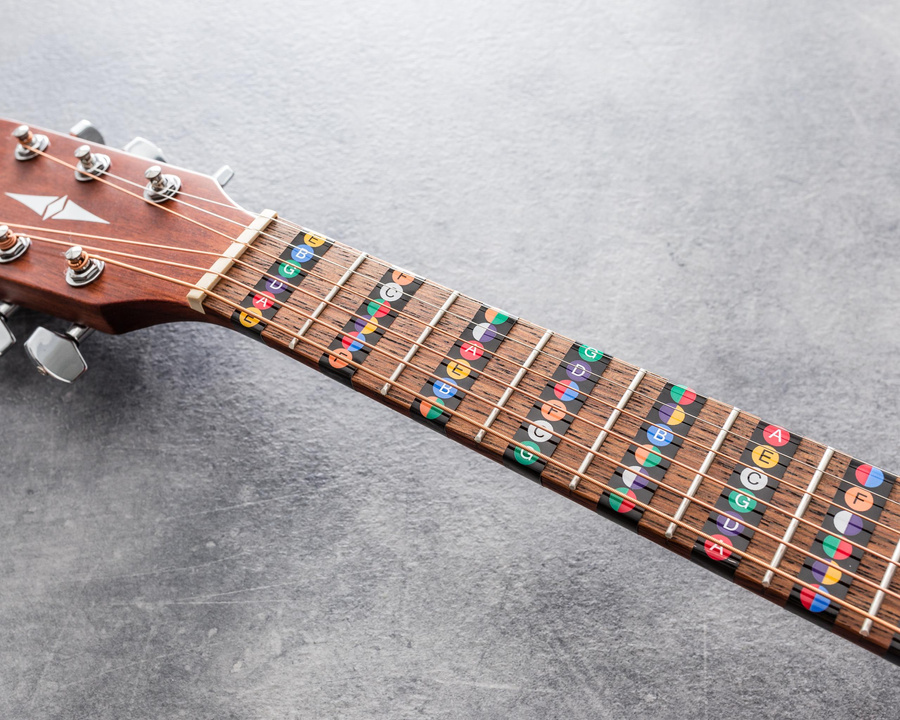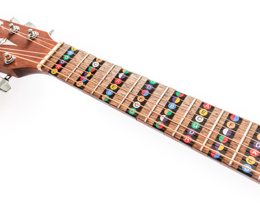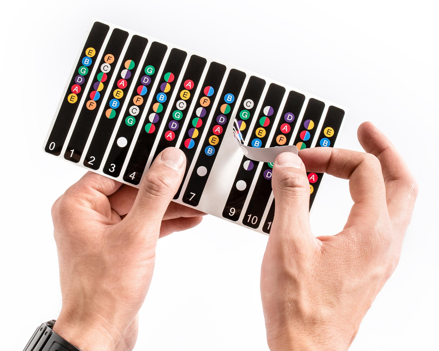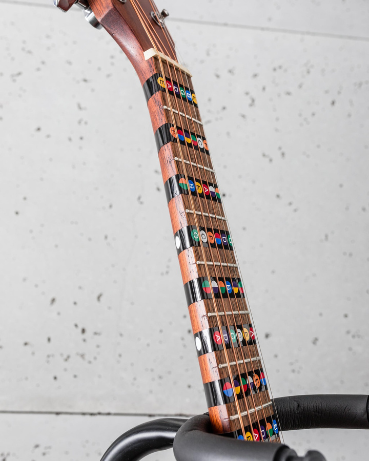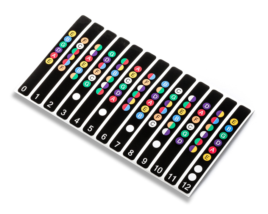 Zestaw 13 naklejek na gryf (podstrunnicę) gitary, by nauka na tym instrumencie poszła śpiewająco :) Naklejki z nazwami dźwięków przydadzą się i pomogą każdemu adeptowi gry na gitarze akustycznej. Naklejka wykonana jest na czarnym podłożu, by była dobrze widoczna, ponadto jest powlekana warstwą ochronną, by jak najdłużej służyć uczącemu się.