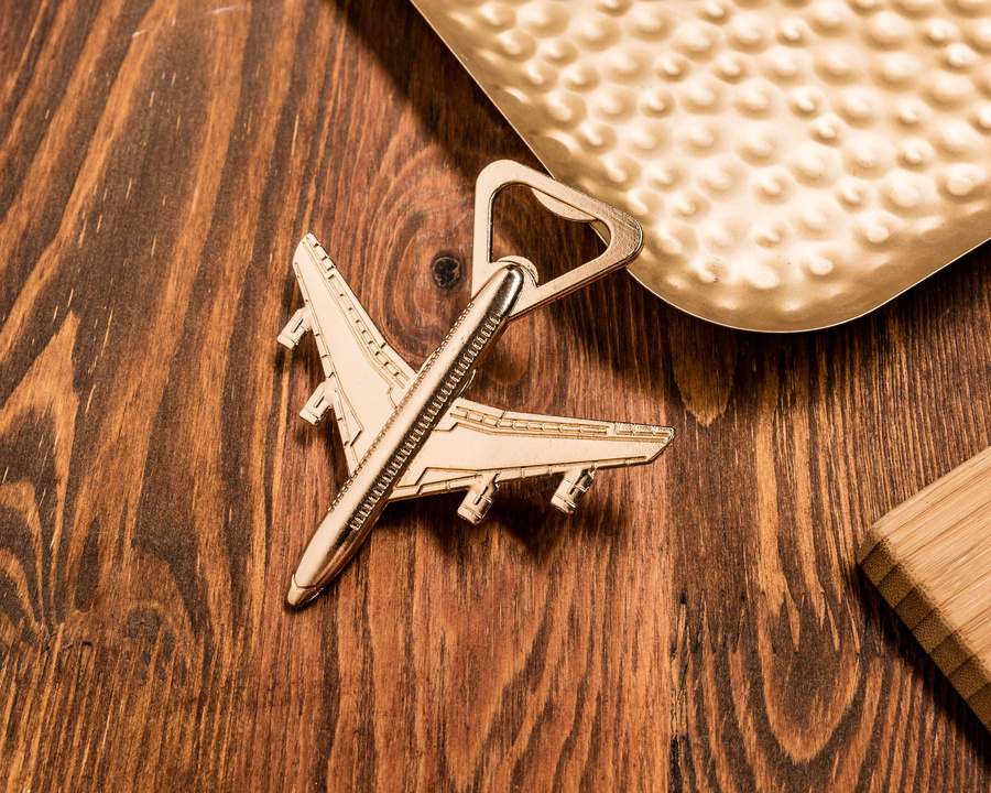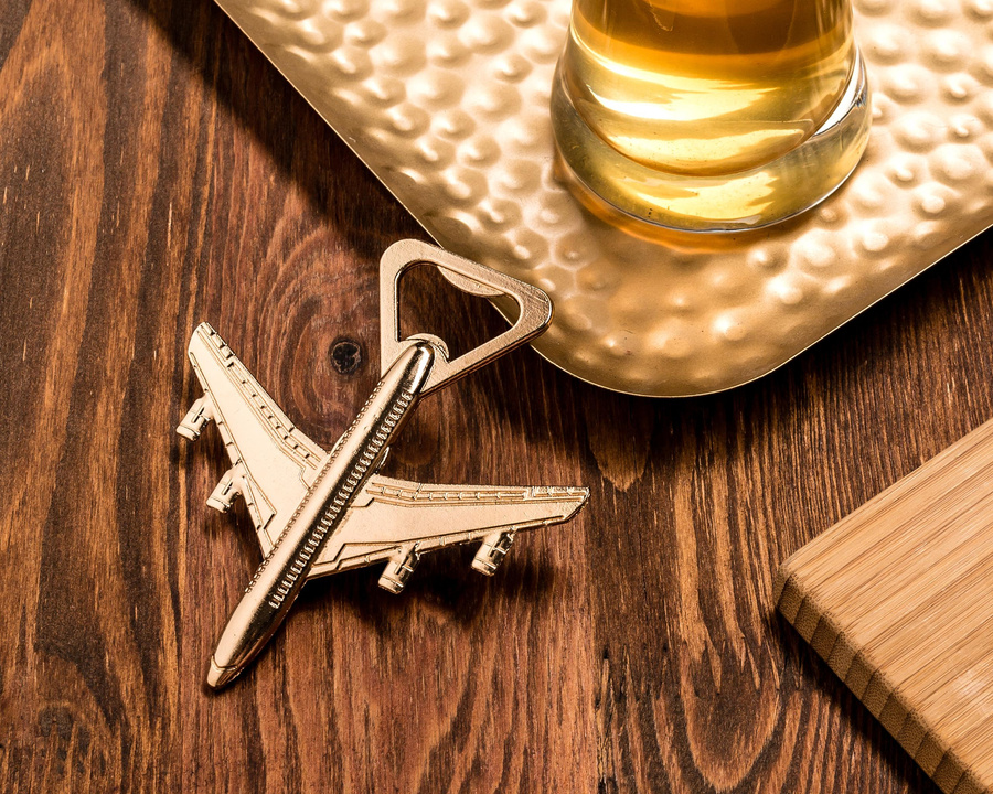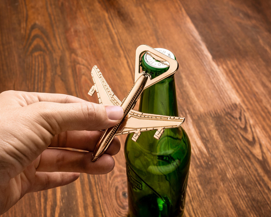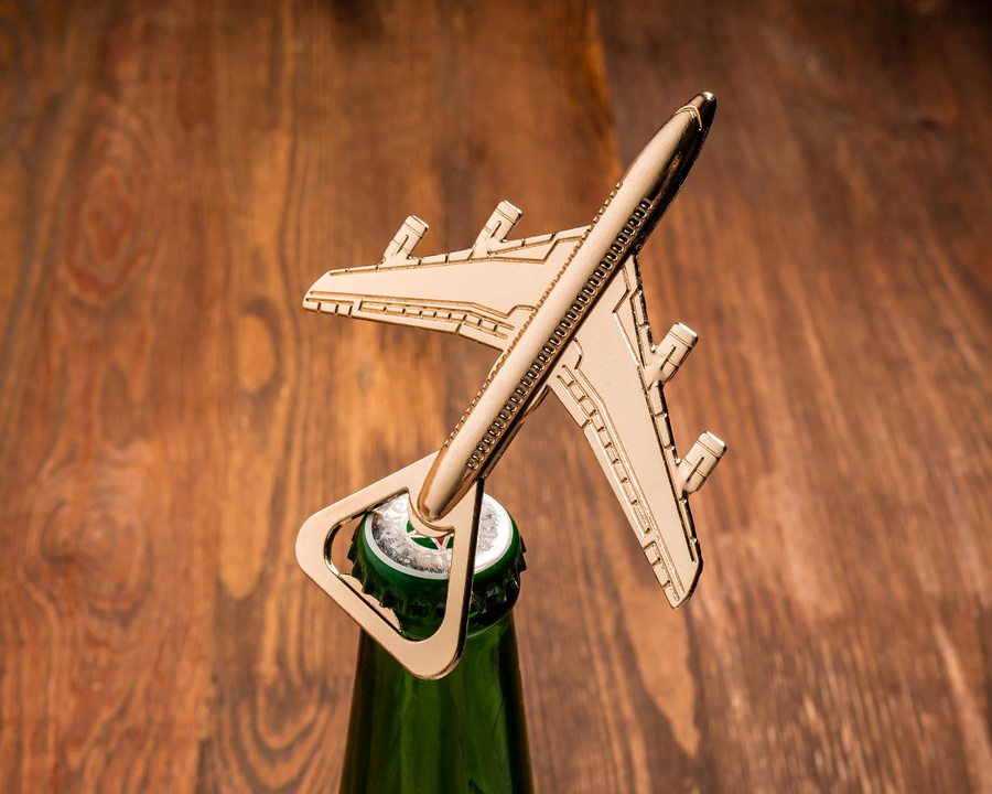 - Poręczny otwieracz do butelek w kształcie samolotu przywołującego wspomnienia urlopów, super wakacji, dalszych wypadów na weekend czy podróży życia :)
