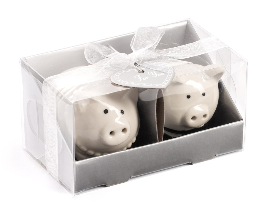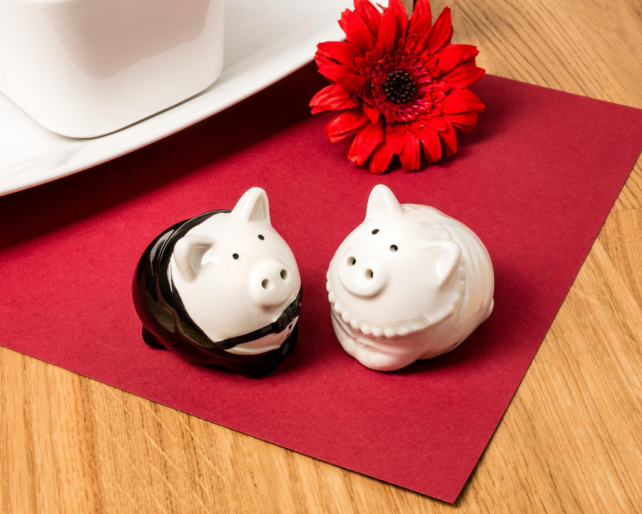 Sympatyczne przyprawniki w kształcie świnek w eleganckich wyjściowych strojach. Solniczka i pieprzniczka wykonane z ceramiki to miły, praktyczny i niejednoczenie uniwersalny pomysł na prezent. Elegancko zapakowane w upominkowy kartonik. Świetny pomysł na prezent, nie tylko dla Młodej Pary.