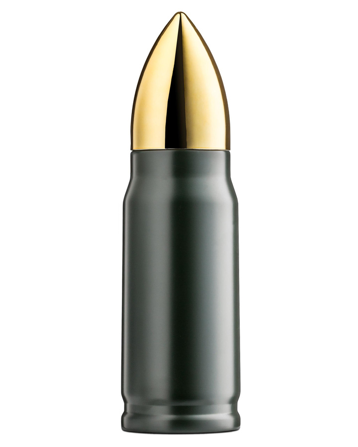 Termos militarny w iście męskim stylu. Wyglądem do złudzenia przypomina pocisk artyleryjski, ale zamiast ładunku miotającego możesz napełnić go ulubioną herbatą lub aromatyczną kawą, która przez długi czas będzie ciepła, a nawet gorąca i gotowa, by rozgrzać Cię w czasie survivalowych wypraw. Dzięki zamknięciu, które posiada silikonową uszczelkę i przycisk otwierający, w wygodny sposób możesz nalewać płyn do kubka za który może posłużyć Ci głowica pocisku.