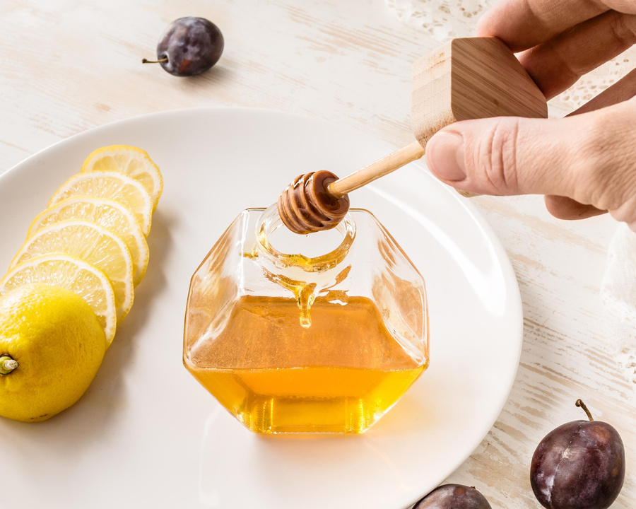 - Ozdobny szklany słoiczek na miód w sześciokątnym kształcie przywodzącym na myśl plaster miodu ze specjalną drewnianą łyżeczką do nakładania miodu.