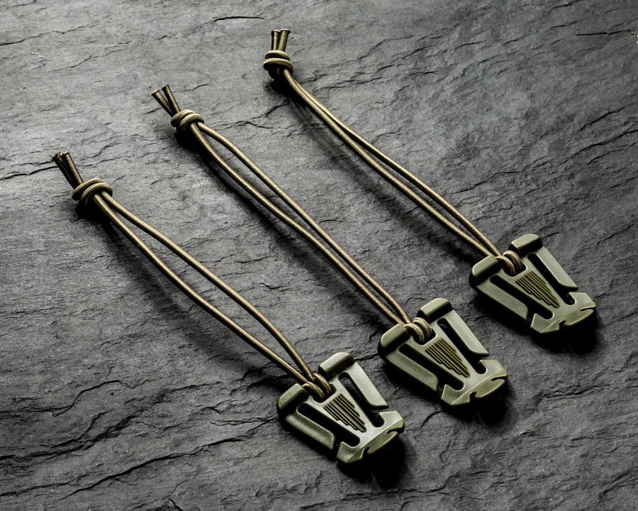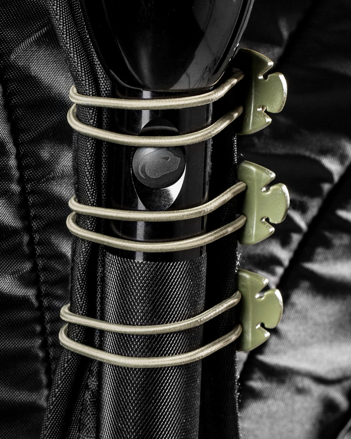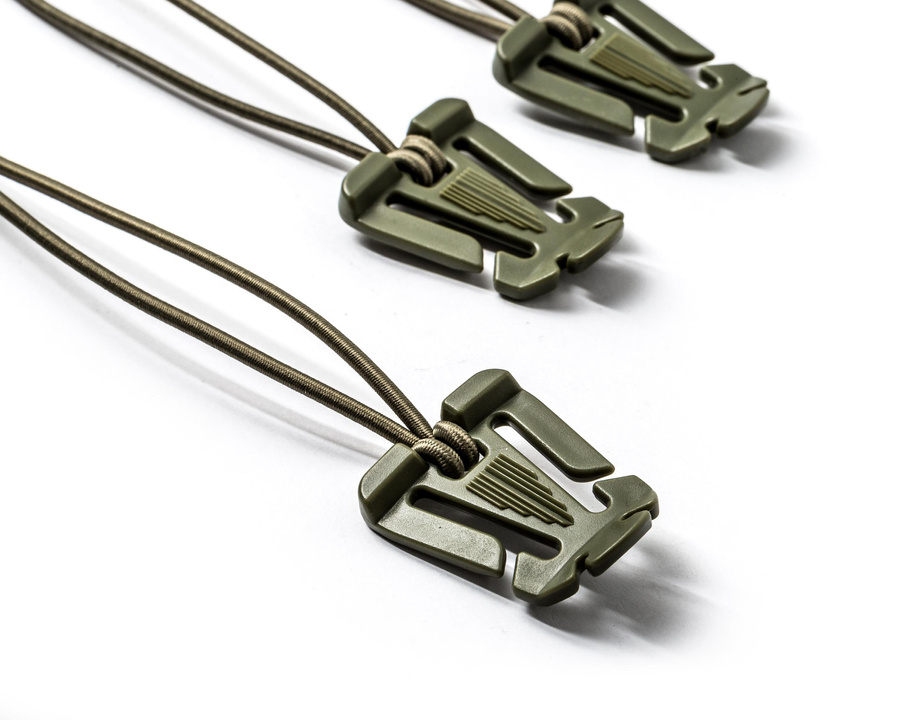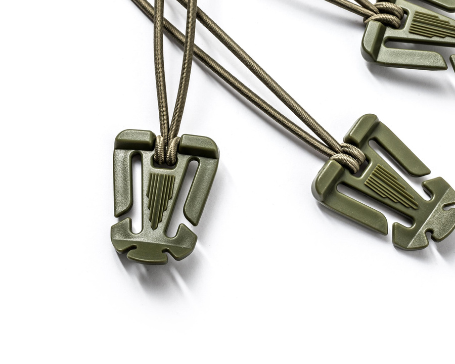- Bardzo praktyczne klamry z gumką do przytraczania różnych niezbędnych sprzętów na wyprawy do plecaków głównie z systemem Molle (ale nie tylko) czy szlufki spodni lub paska. Dzięki nim również w mig zapanujesz nad nadmiarem pasków przy plecaku.