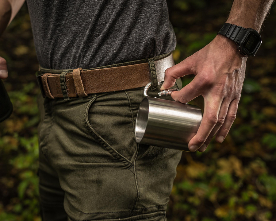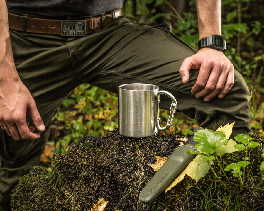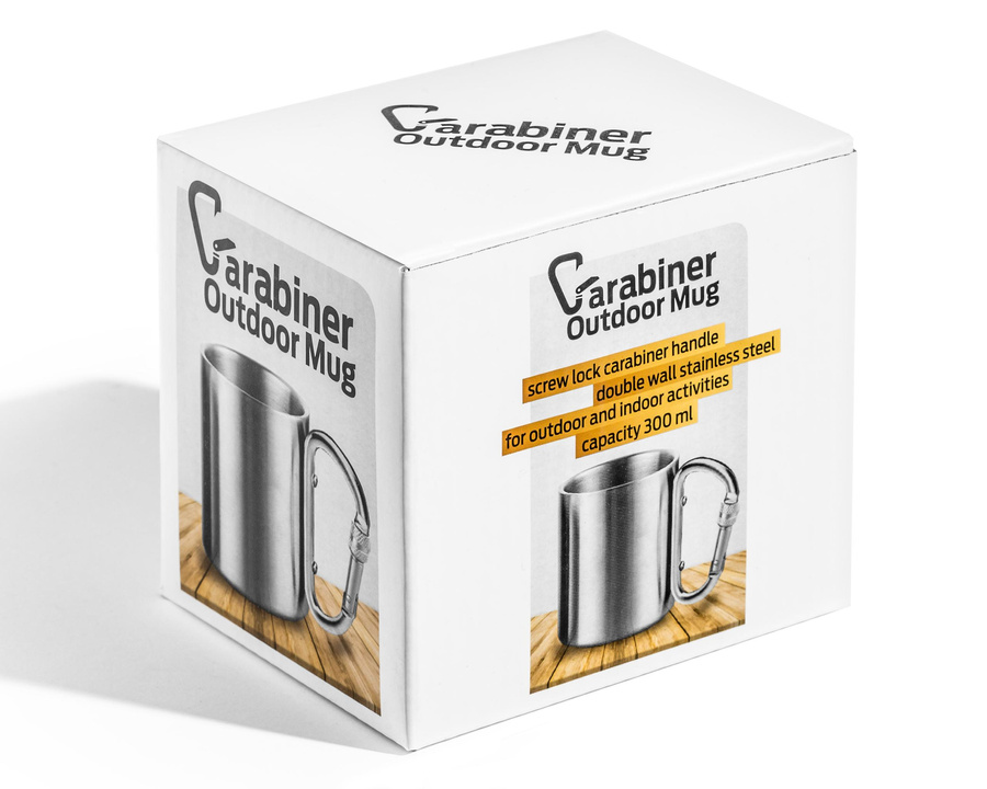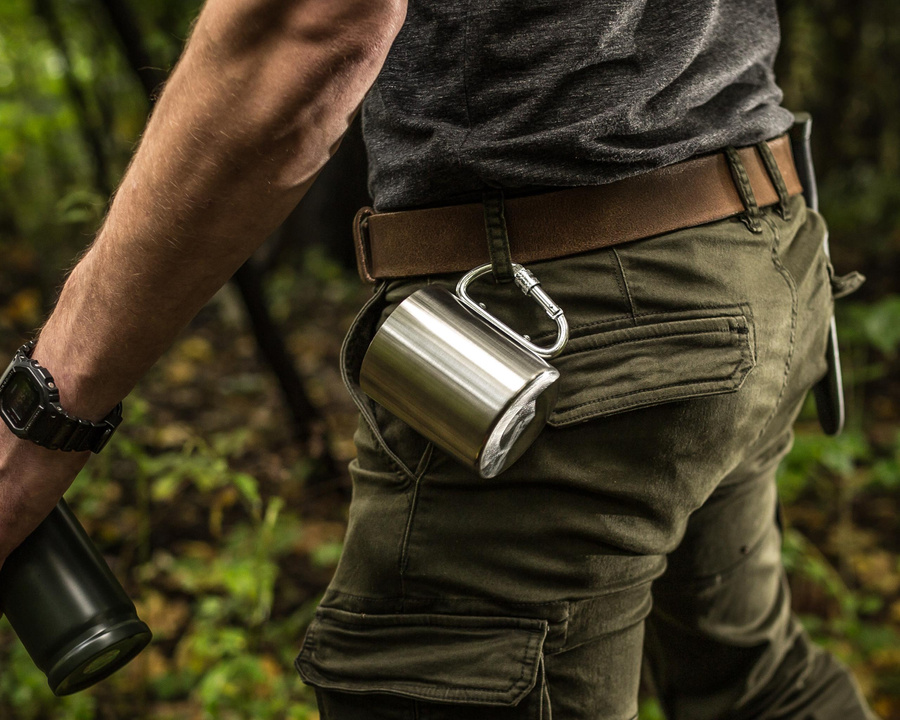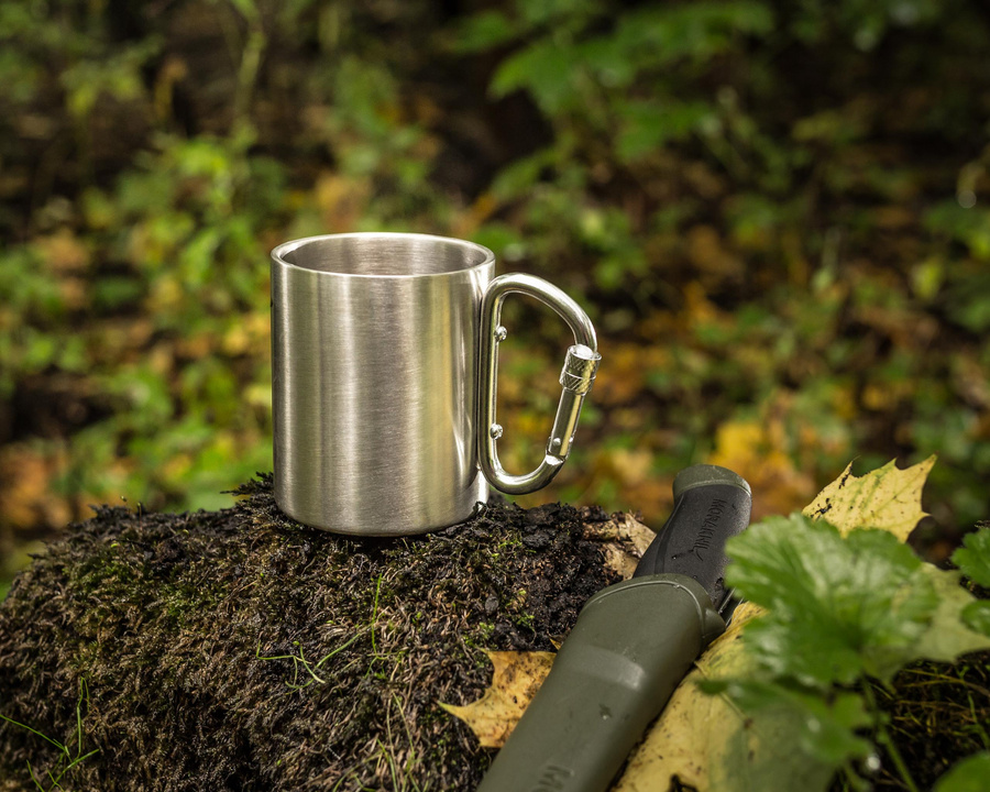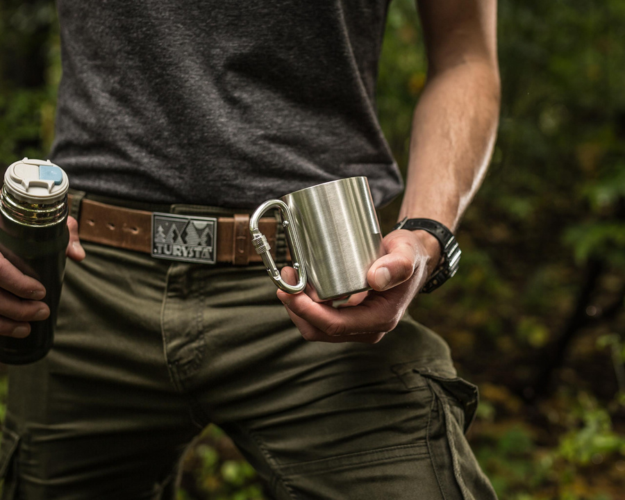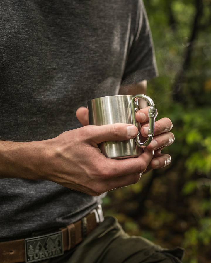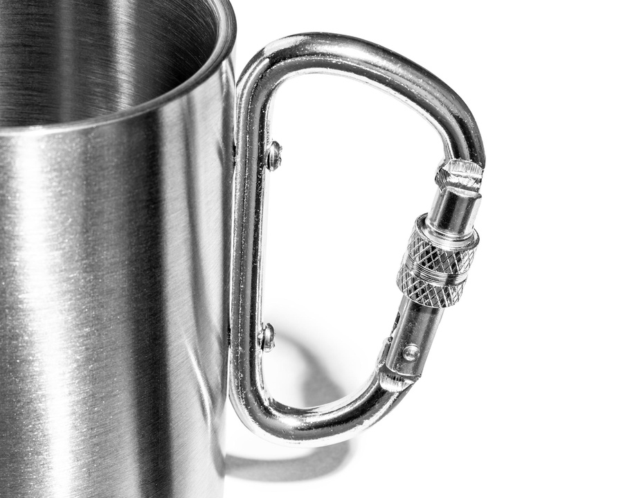 - kubek turystyczny ze stali szlachetnej z karabińczykiem