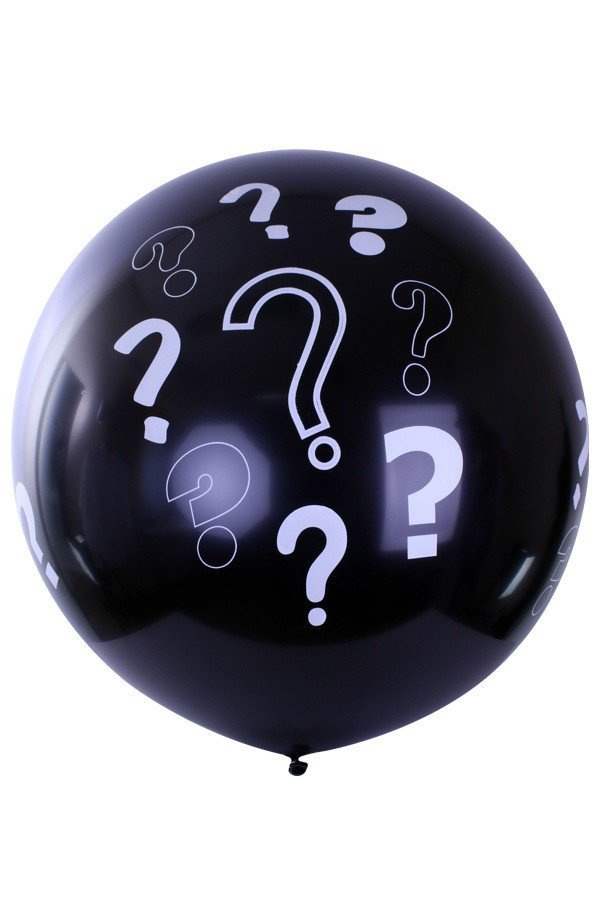 - Olbrzymi czarny balon ozdobiony znakami zapytania, przeznaczony do napełnienia konfetti w wybranym kolorze. Rozmiar: 36", ok. 92 cm