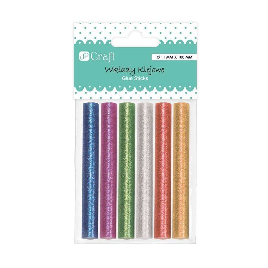 - Zestaw wkładów klejowych z brokatem do pistoletu do kleju na gorąco. Opakowanie zawiera 5 sztuk wkładów o wymiarach 11 mm x 100 mm.