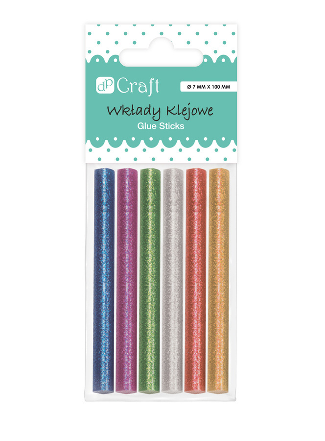 - Zestaw wkładów klejowych z brokatem do pistoletu do kleju na gorąco. Opakowanie zawiera 5 sztuk wkładów o wymiarach 7 mm x 100 mm.