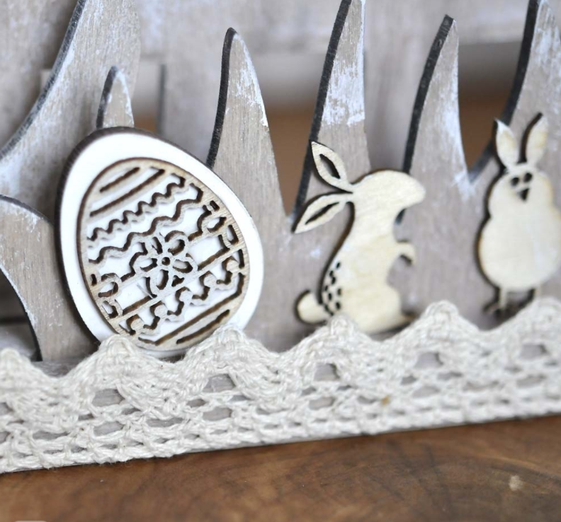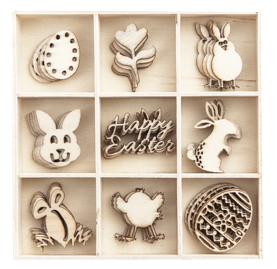 • W drewnianej skrzyneczce znajduje się 45 aplikacji, w tym 9 różnych wzorów. Nadaj wielkanocny klimat swoim projektom! Wielkość opakowania: 10,5 x 10,5 cm.