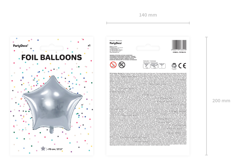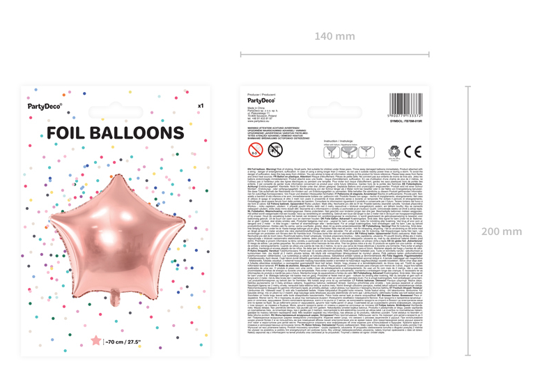 - Balon foliowy metalizowany w kształcie gwiazdki w kolorze złotym, wysokość przed napompowaniem ok. 84 cm (33''), wysokość po napompowaniu ok. 70 cm (27.5'').