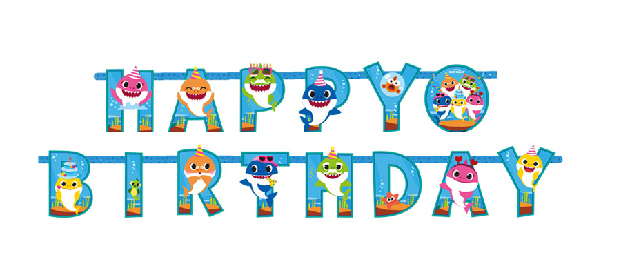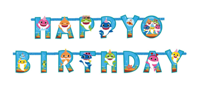- Baner z papierowych liter połączonych sznureczkiem tworzących napis Happy Birthday, z motywem żółtego rekina z piosenki Baby Shark.