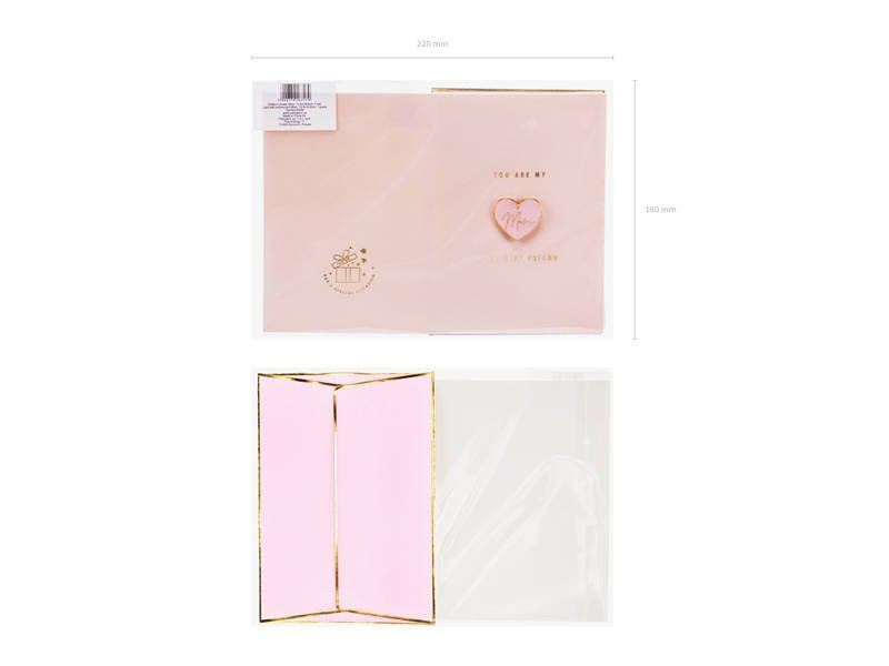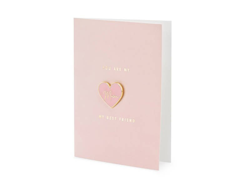 Dodatkowo do kartki przyczepiony jest pin w kształcie serca i napisem "Mom".