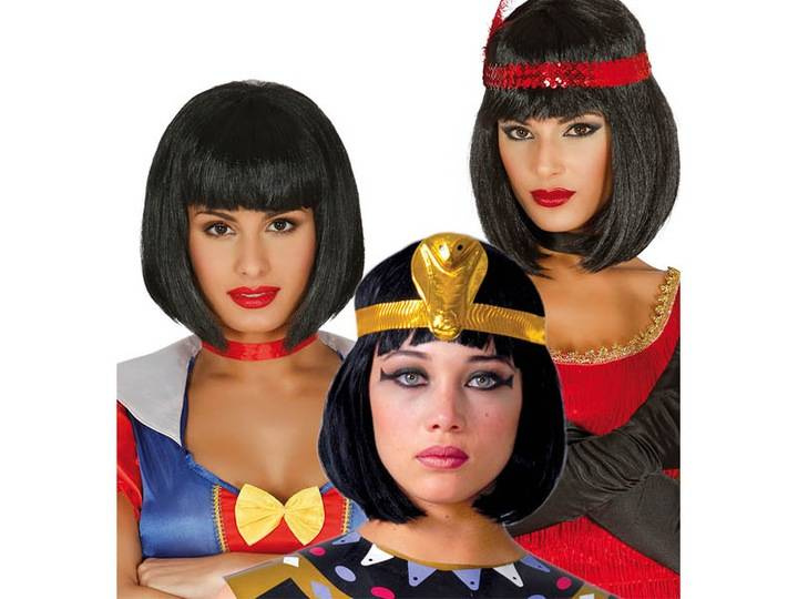 - Damska peruka czarna, w kroju boba, z prostą grzywką. Wykonana ze sztucznych włosów mocowanych na rozciągliwej siatce. Rozmiar uniwersalny.