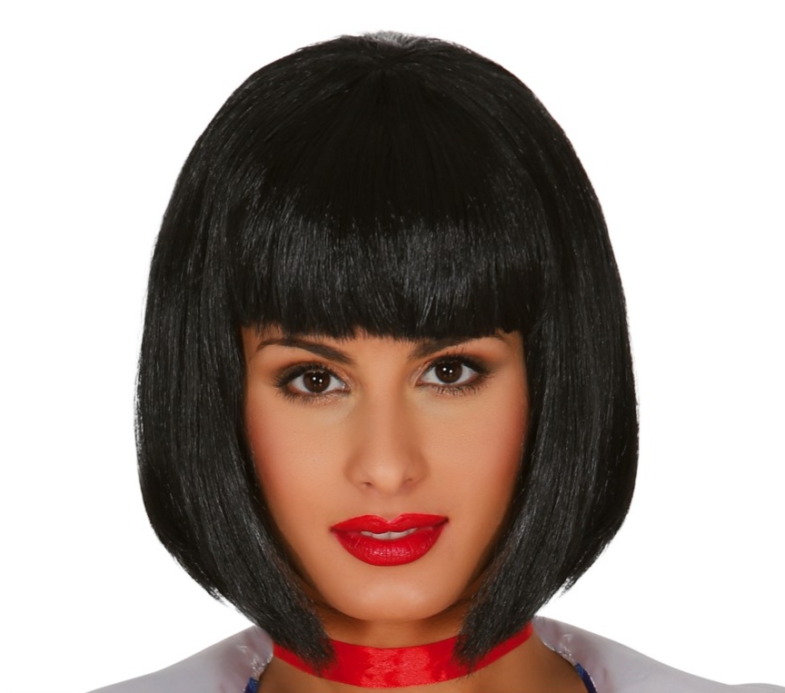 Damska peruka czarna, w kroju boba, z prostą grzywką.