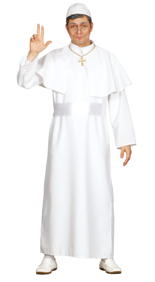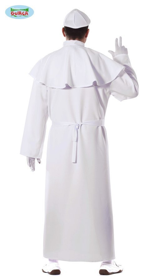 Strój papieża dla dorosłych. Idealne przebranie na karnawał lub inne wydarzenia tematyczne. Centralnym elementem stroju jest długa biała szata z rękawami. Sutanna zakładana jest przez głowę, a z tyłu zapinana na rzep. Na ramiona narzucana jest krótka peleryna, którą przypina się rzepem przy szyi. Całość uzupełnia wiązany pas oraz papieskie nakrycie głowy. Czapka nie posiada żadnych dodatkowych zapięć.