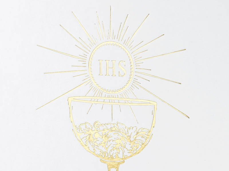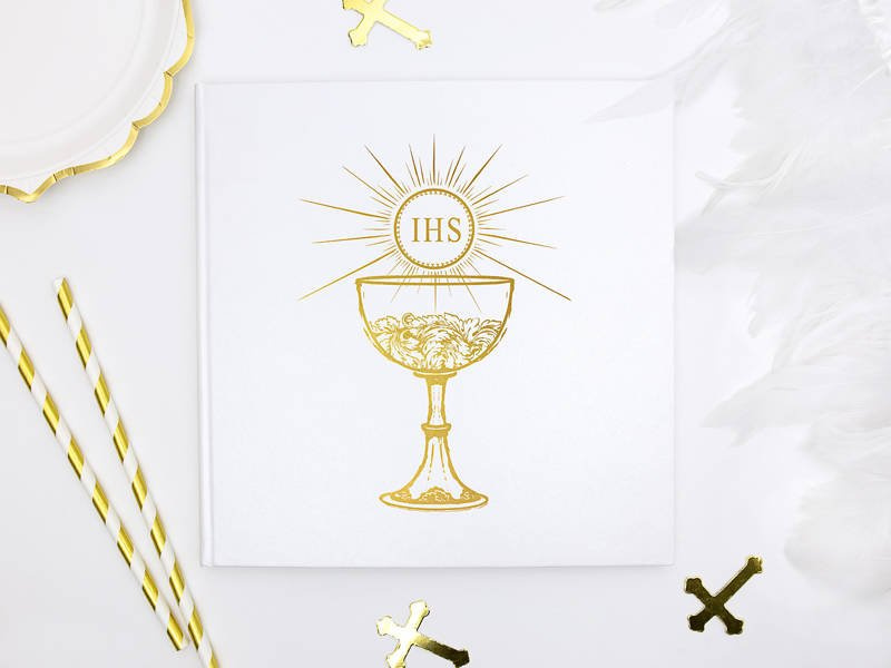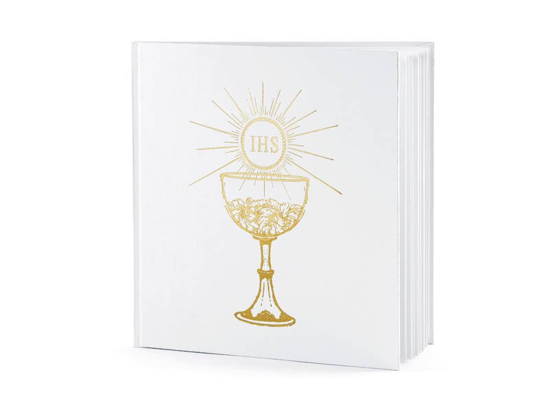 Księga Gości Komunijnych oprawiona perłowym papierem w kolorze białym, ze złotym kielichem