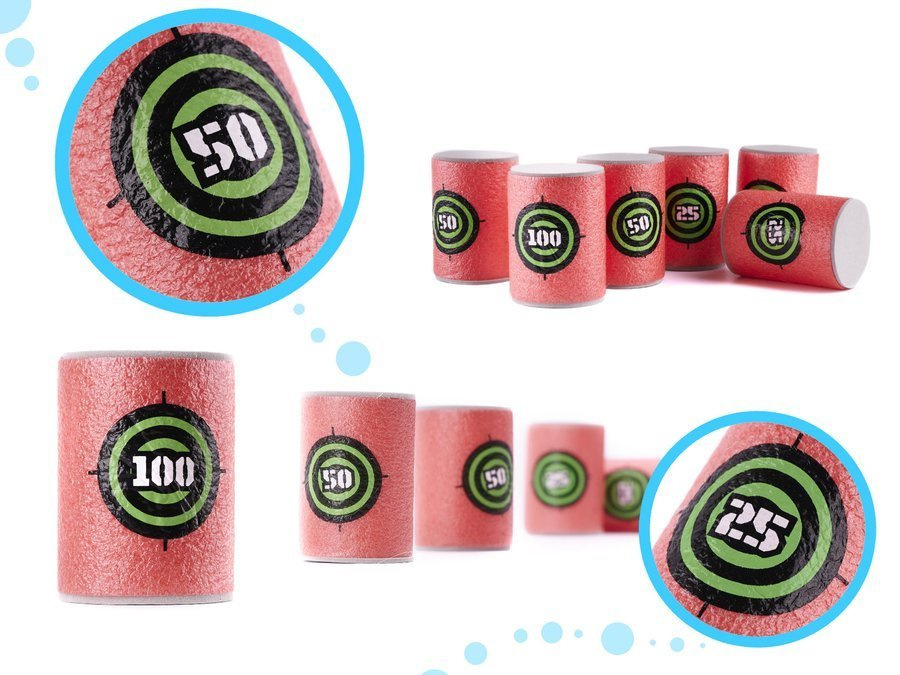 Zestaw 6 piankowych celów do wyrzutni na miękkie strzałki, w kształcie beczek.